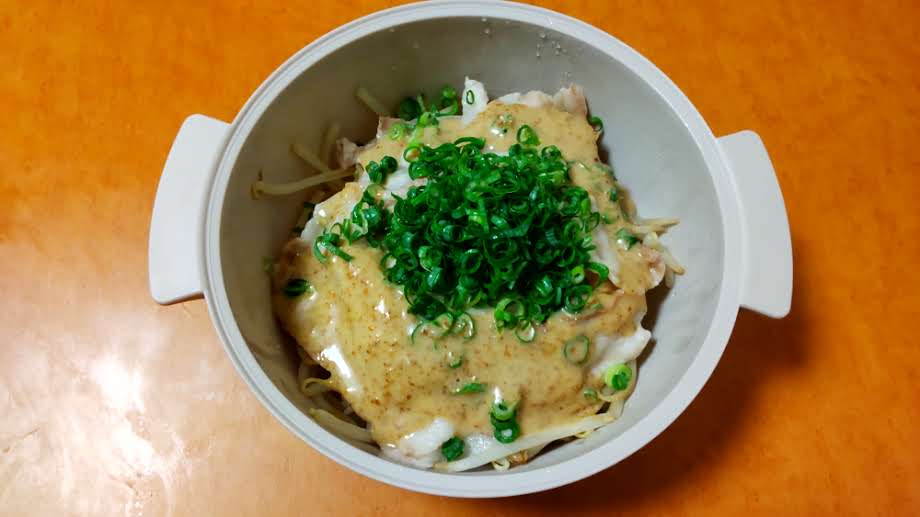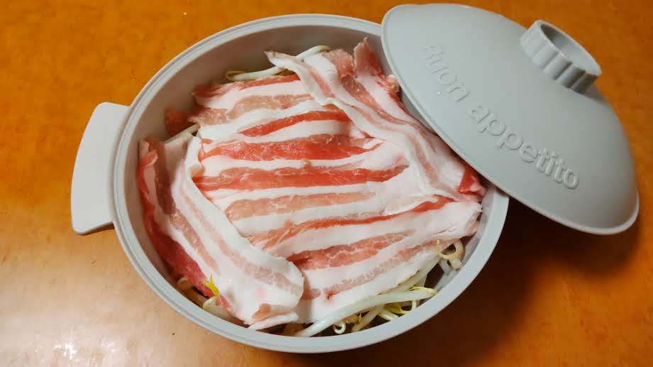写真の様に本日は28円のもやしと豚肉数枚をビストロヌードルに入れて、電子レンジで500W3分ほど加熱。