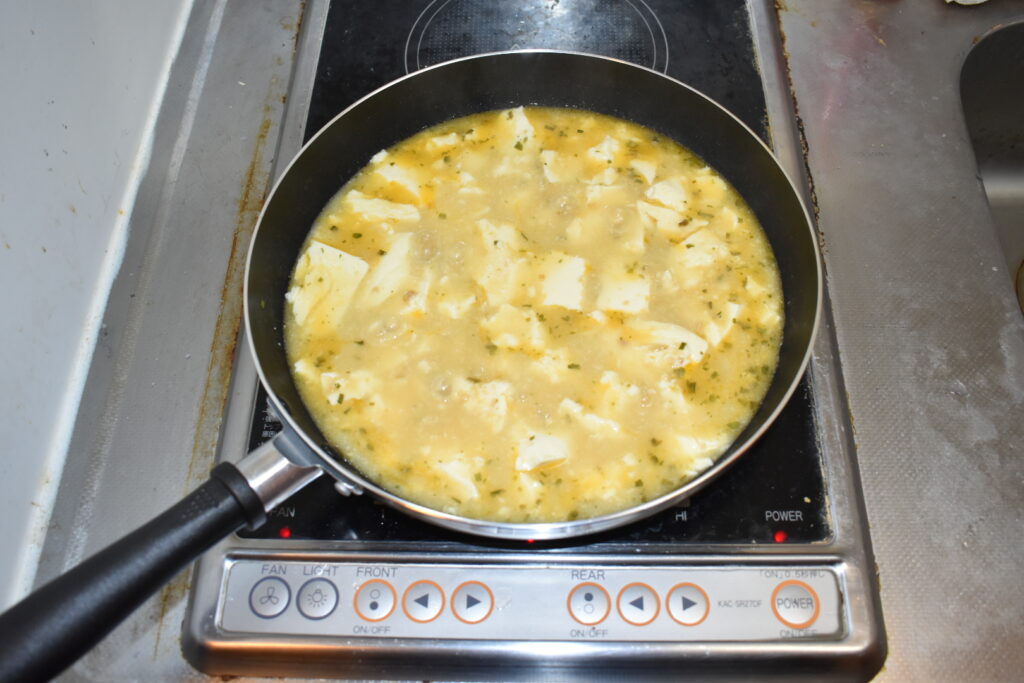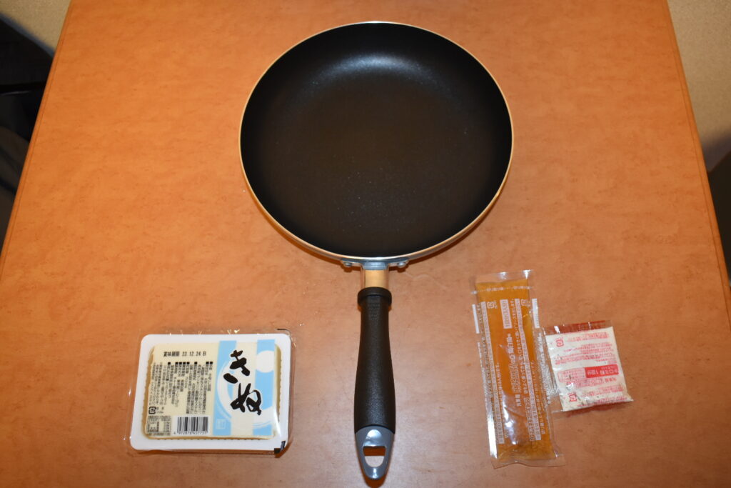 フライパンはダイソーで300円、豆腐スーパーで60円、マーボー豆腐は1箱180円(2食入り)。
